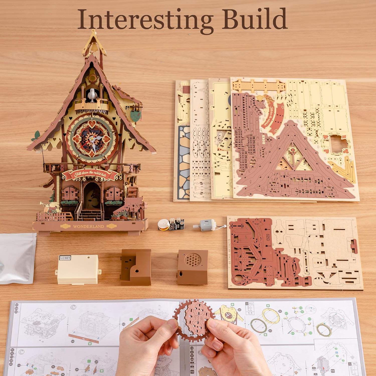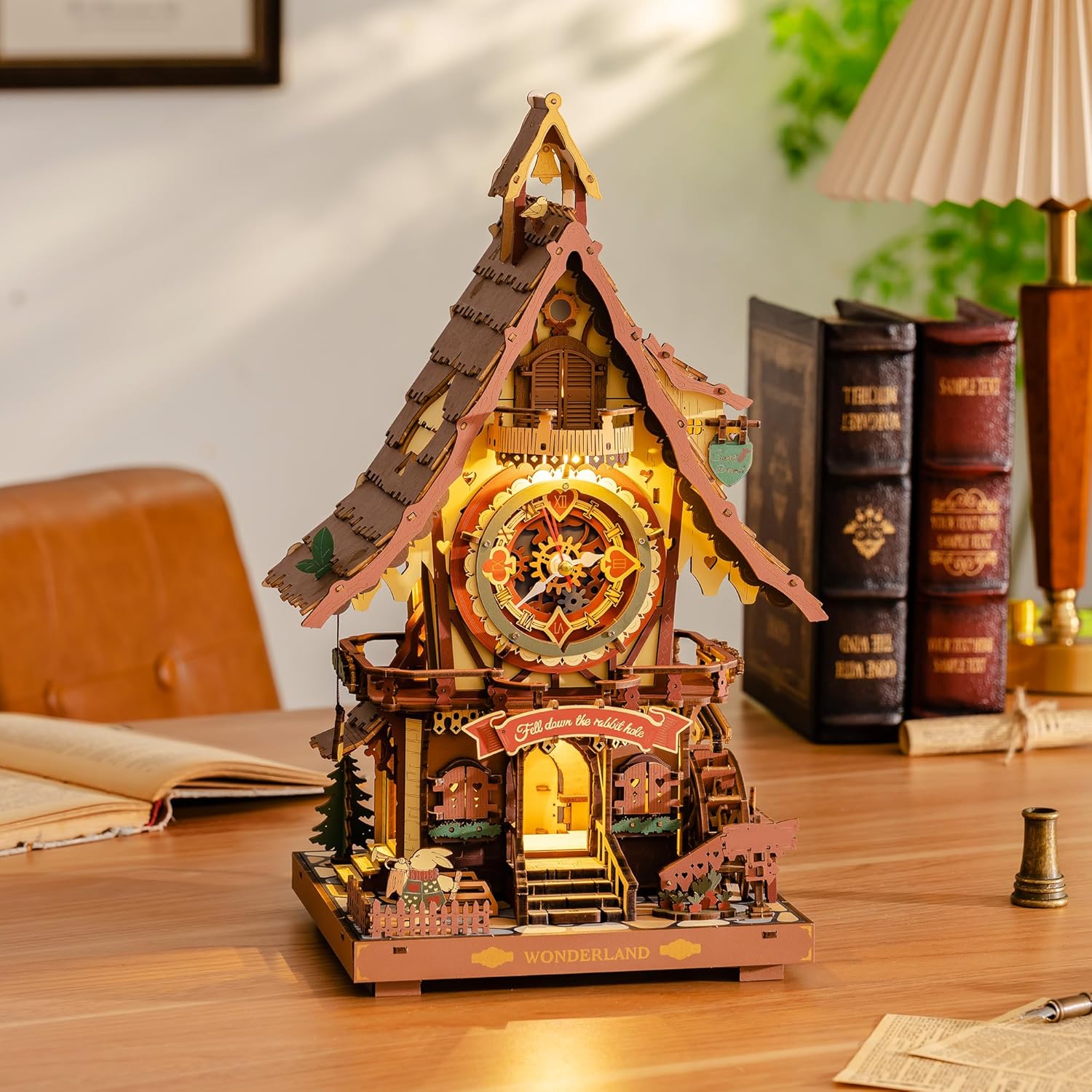 Step into a world of whimsy with the ROKR Cuckoo Clock, a meticulously crafted wooden puzzle that merges functional timekeeping with storybook charm. This mechanical masterpiece features a charming woodland cottage nestled within an enchanted forest, complete with a spinning waterwheel, wooden fencing, and lush greenery. The clock delivers authentic hourly chiming via an animated cuckoo bird, while a crescent-shaped pendulum, thatched roof, and vintage-style pull light switch add authentic character. Playful details—including card suit motifs on the roof and clock face—enhance its whimsical appeal. A hidden stair switch controls the cuckoo mechanism and hourly chime settings. Available in both stained and natural wood finishes, this precision-engineered puzzle combines traditional German woodworking techniques with imaginative design, making it an exceptional decorative timepiece for collectors and enthusiasts alike.