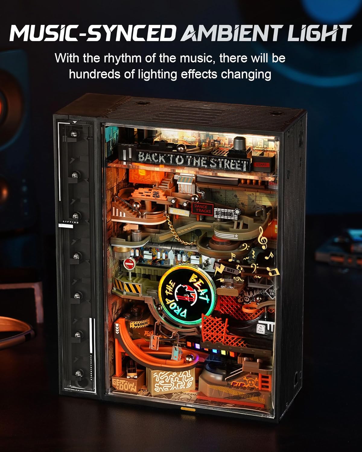 Experience the ultimate fusion of engineering and entertainment with the ROKR Hip-Hop Street Marble Run. This mechanical 3D puzzle captivates with dynamic sound-responsive LED lights that pulse and dance to the rhythm, transforming each marble's journey into a visual spectacle. Watch as intricate marble pathways guide spheres through a vibrant urban landscape, while synchronized lighting effects create an immersive, multi-sensory experience. Perfect for enthusiasts seeking a sophisticated blend of mechanical precision, interactive gameplay, and contemporary street-inspired aesthetics. An engaging challenge that rewards both builders and observers with mesmerizing motion and light.