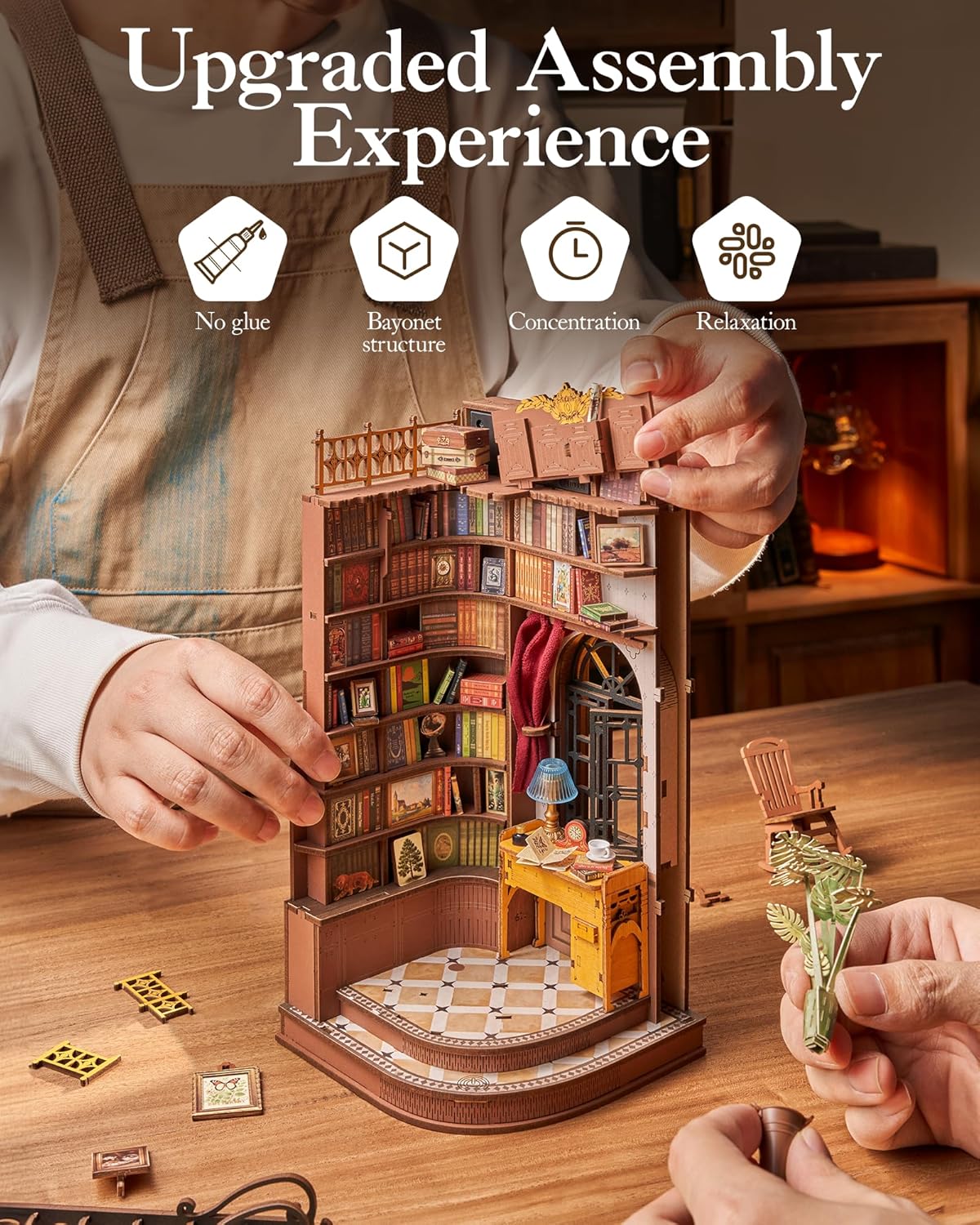 Discover the refined artistry of the Rolife Silent Corner Study, a meticulously crafted DIY book nook that embodies British design elegance. This sophisticated shelf insert transforms your bookcase into a captivating display of miniature craftsmanship, featuring vintage bookshelves, period furniture, and intricate architectural details that evoke a serene study atmosphere. Beyond its aesthetic appeal, this functional bookend secures your collection while serving as a conversation-starting art piece. Each component is thoughtfully designed to deliver an engaging building experience, rewarding you with a stunning, museum-quality miniature world that celebrates the quiet charm of classic British interiors.